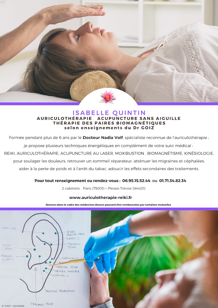 Isabelle Quintin, énergeticienne, praticienne Reiki, j'ai été formée à l'auriculothérapie par le Docteur Nadia Volf